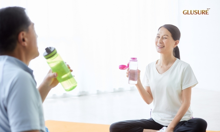 - ตรวจวัดระดับน้ำตาลในเลือดก่อนและหลังออกกำลังกาย หากค่าต่ำกว่า 100 mg/dL ควรกินอาหารว่างเบาๆ (เช่น แครกเกอร์, นมไม่มีน้ำตาล) ก่อนเริ่ม