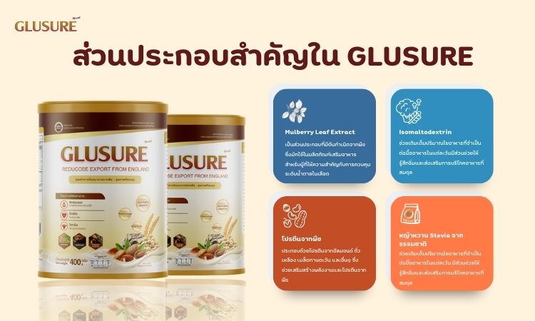 Glusure เป็นผลิตภัณฑ์เสริมอาหารชนิดผงสำหรับชงดื่ม ที่ใช้เป็นมื้อว่างทางโภชนาการ โดยเหมาะเป็นอย่างยิ่งสำหรับผู้ที่ต้องการควบคุมระดับน้ำตาลในเลือด